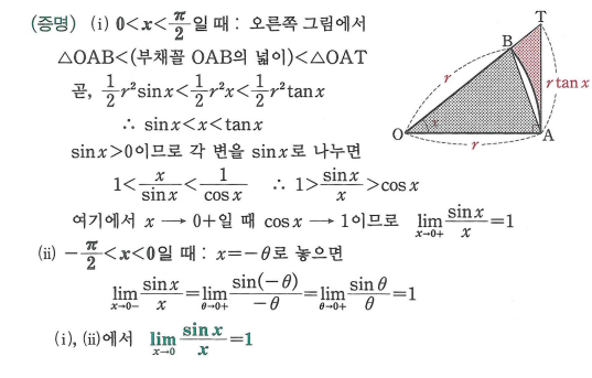미적분 교과서에는 원의 넓이를 $$2\displaystyle\int_0^1 \sqrt{1-x^2}$$로 구합니다. 이 적분값을 구하는 과정에서 $\sin x$의 도함수가 $\cos x$임을 사용하게 됩니다. 이것은 $$\displaystyle\lim_{x\to 0}\dfrac{\sin x}{x}=1$$임을 이용하여 증명되는데 증명하는 과정에서 부채꼴의 넓이가 $\frac{1}{2}x$임을 가정하고 씁니다. 정석에서도 다음과 같이 증명되어 있습니다.