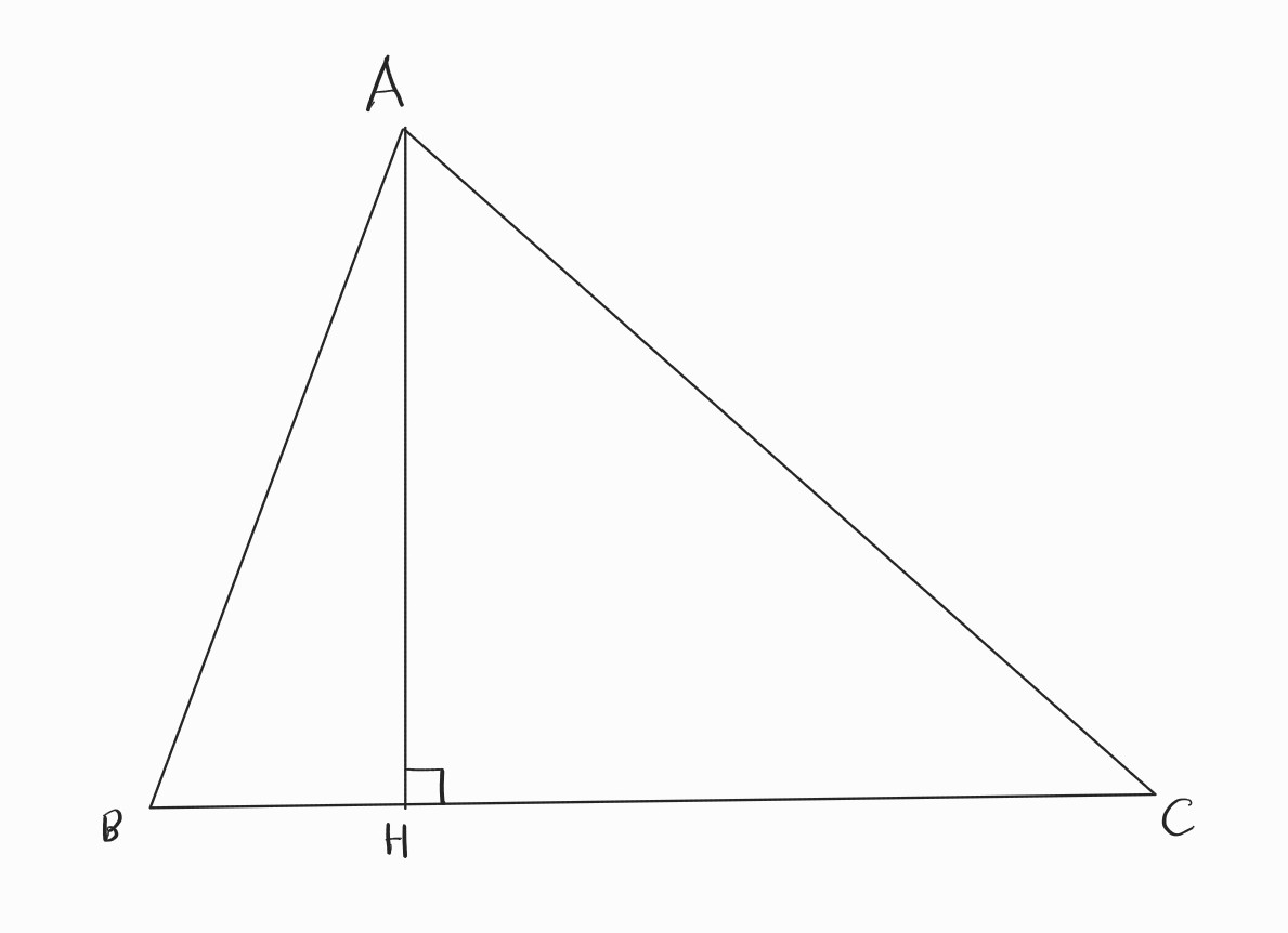 이와 같은 삼각형에서 점 $\rm A$에서 변 $\rm BC$에 내린 수선의 발을 $\rm H$라 하자. 높이 $\rm AH$을 $h$, $\rm BH$의 길이를 $t$라 하자. 이제 피타고라스 정리를 두 번 사용하면, $$h^2=c^2-t^2=b^2-(a-t)^2$$이므로 $$t^2=\frac{a^2-b^2+c^2}{2a}$$을 얻는다. 이를 첫 식에 대입하여 $h$을 구하면, $$h^2=c^2-t^2=\frac{4a^2c^2-(a^2-b^2+c^2)}{4a^2}$$을 얻는다. 삼각형의 넓이를 구하는 기본 식 $S=\frac{1}{2}ah$에 얻은 $h$을 대입할 것이다. 넓이의 제곱을 해 주면 계산이 편하므로, $$\begin{aligned} S^2 & =\frac{1}{4}a^2h^2 \\ & = \frac{1}{4} \cdot a^2 \cdot \frac{(2ac)^2-(a^2-b^2+c^2)}{4a^2} \\ & =\frac{1}{16} \cdot \left( (2ac)^2-(a^2-b^2+c^2) \right) \\ & =\frac{1}{16} \cdot (a^2+2ac+c^2-b^2) \cdot (b^2-a^2+2ac-c^2) \\ & =\frac{1}{16} \cdot \left( (a+c)^2-b^2 \right) \cdot \left( b^2-(a-c)^2 \right) \\ & =\frac{1}{16} \cdot (a+b+c) (-a+b+c) (a-b+c) (a+b-c) \\ & =\frac{a+b+c}{2} \cdot \frac{-a+b+c}{2} \cdot \frac{a-b+c}{2} \cdot \frac{a+b-c}{2} \\ & =s(s-a)(s-b)(s-c) \end{aligned}$$ 이다. 결론적으로 $S=\sqrt{s(s-a)(s-b)(s-c)}$을 얻을 수 있다. $\blacksquare$