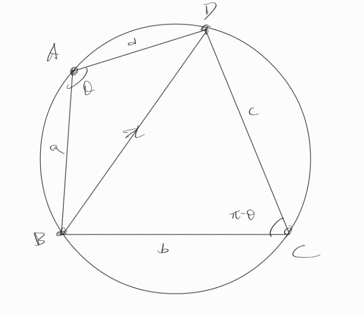 $\cos\theta=\frac{a^2+d^2-b^2-c^2}{2(ad+bc)}$